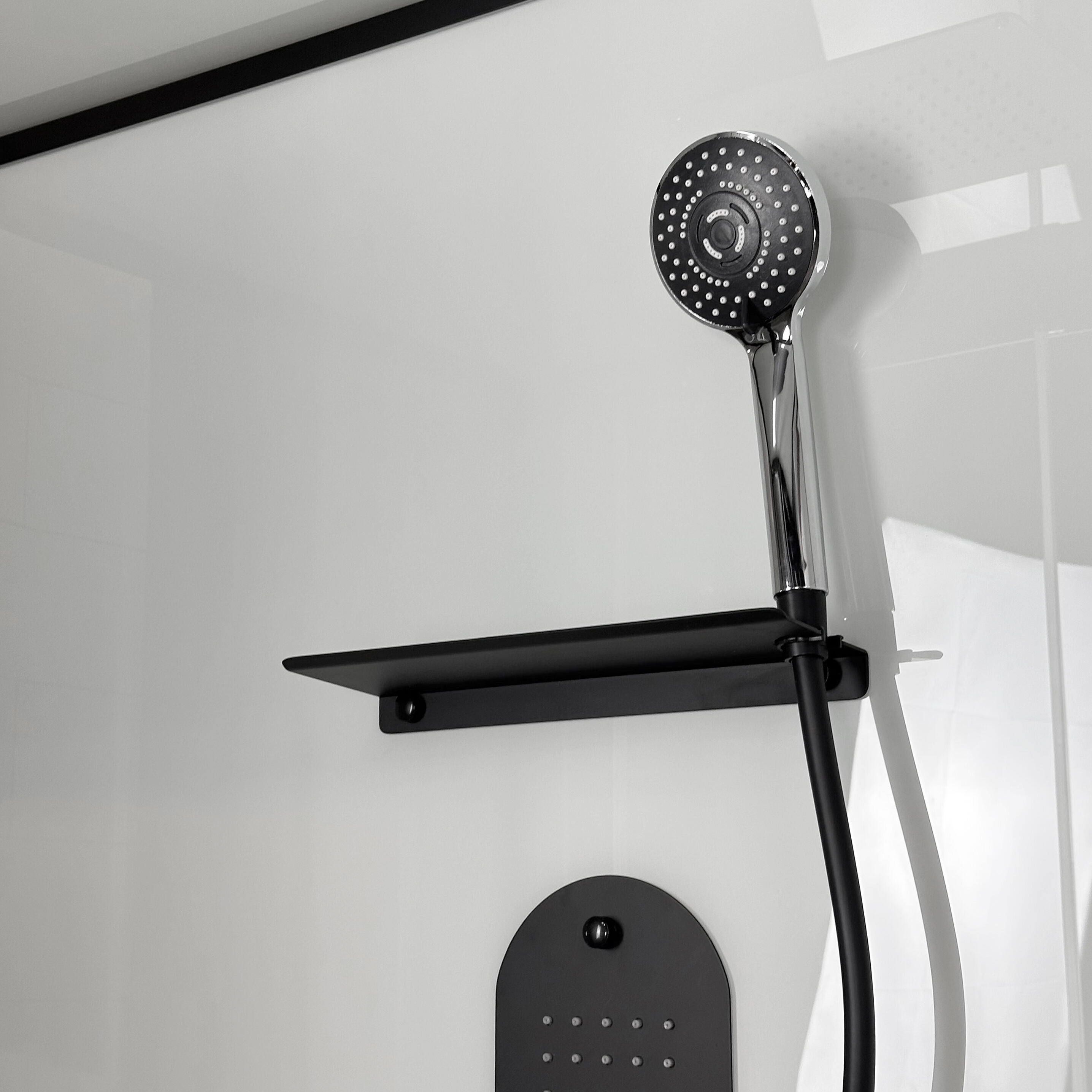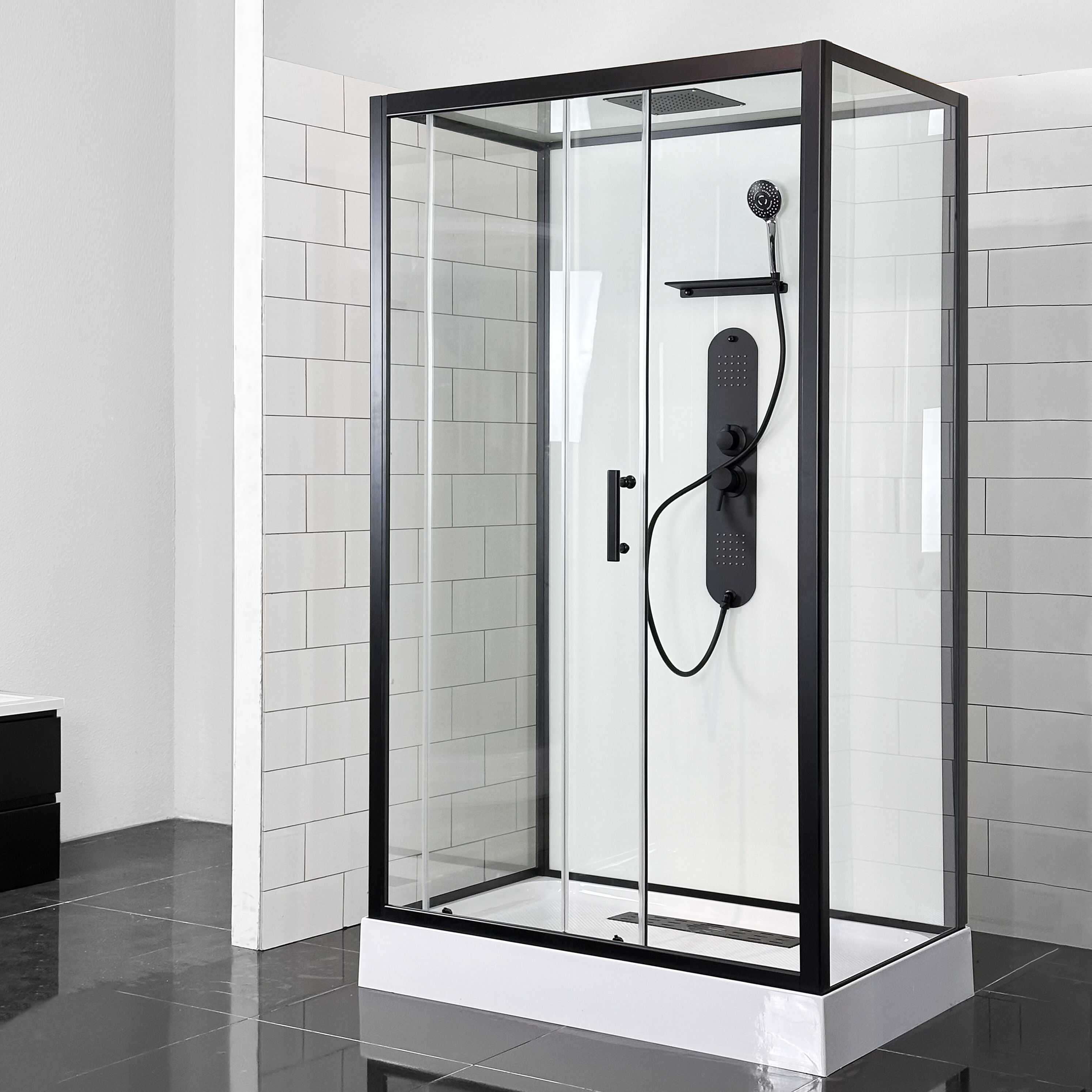 Phòng tắm HOKO hiện đại kính cường lực 5mm màu đen với kiểu dáng thẳng, cửa trượt, có khung, phù hợp cho khách sạn